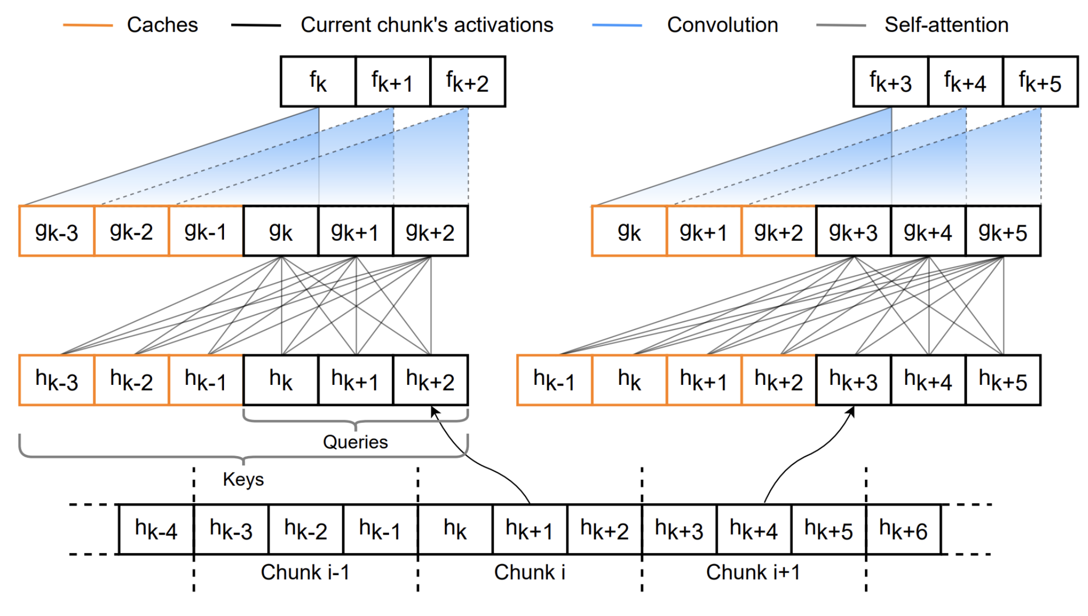 The caching schema of self-attention and convolution layers for consecutive chunks is as follows. For more details, please refer to [1].