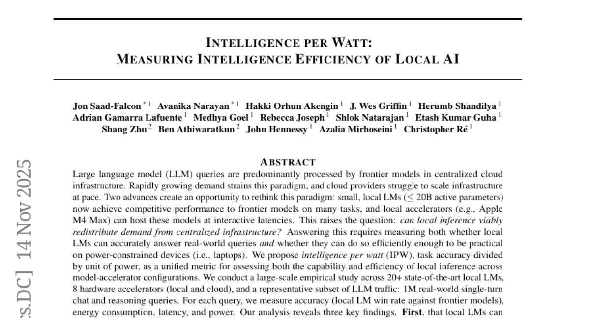 Intelligence per Watt: Measuring Intelligence Efficiency of Local AI