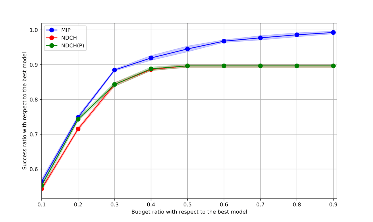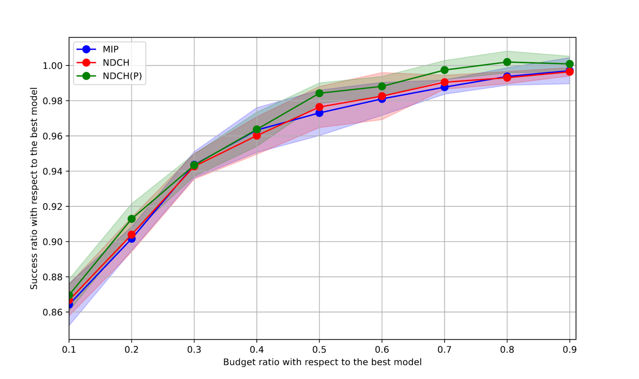 Our experimental results for this dataset are presented in the figure below, where we express the budget as a fraction of the cost of the most expensive model available, based on the values in the table above. The findings indicate that the MIP-based routing approach achieves 95% of the best model’s performance while using only 50% of its cost. While MIP significantly outperforms NDCH and NDCH(P), these methods also prove effective in reducing costs, achieving up to 90% of the best model’s performance within the same budget. This highlights that even heuristic-based approaches can yield substantial cost savings while maintaining high performance.