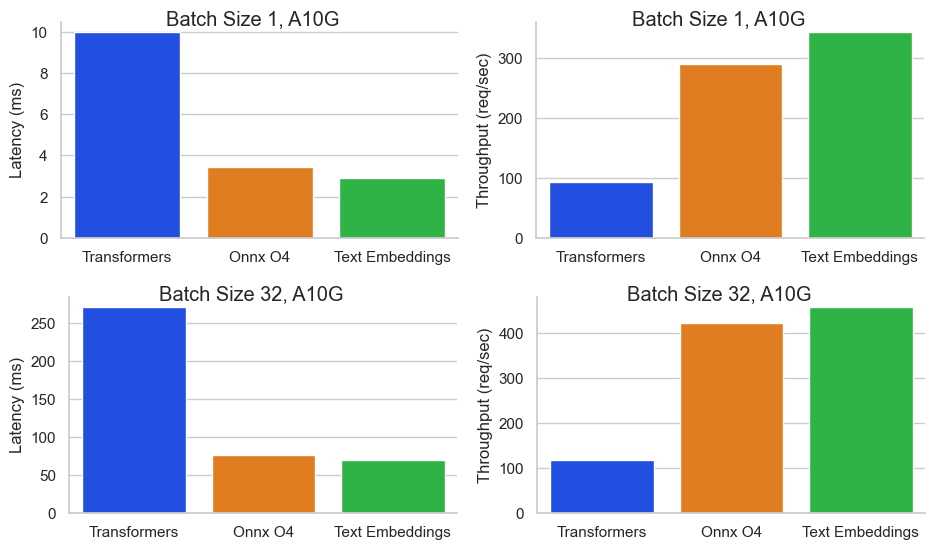Those feature enabled industry-leading performance on throughput and cost. In a benchmark for BAAI/bge-base-en-v1.5 on an Nvidia A10G Inference Endpoint with a sequence length of 512 tokens and a batch size of 32, we achieved a throughput of 450+ req/sec resulting into a cost of 0.00156$ / 1M tokens or 0.00000156$ / 1k tokens. That is 64x cheaper than OpenAI Embeddings ($0.0001 / 1K tokens).