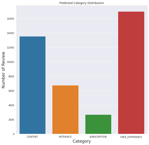 As it comes to the categories defined before, it seems that the model predicts most of the reviews are about users' experiences (excluding experiences related to other categories):