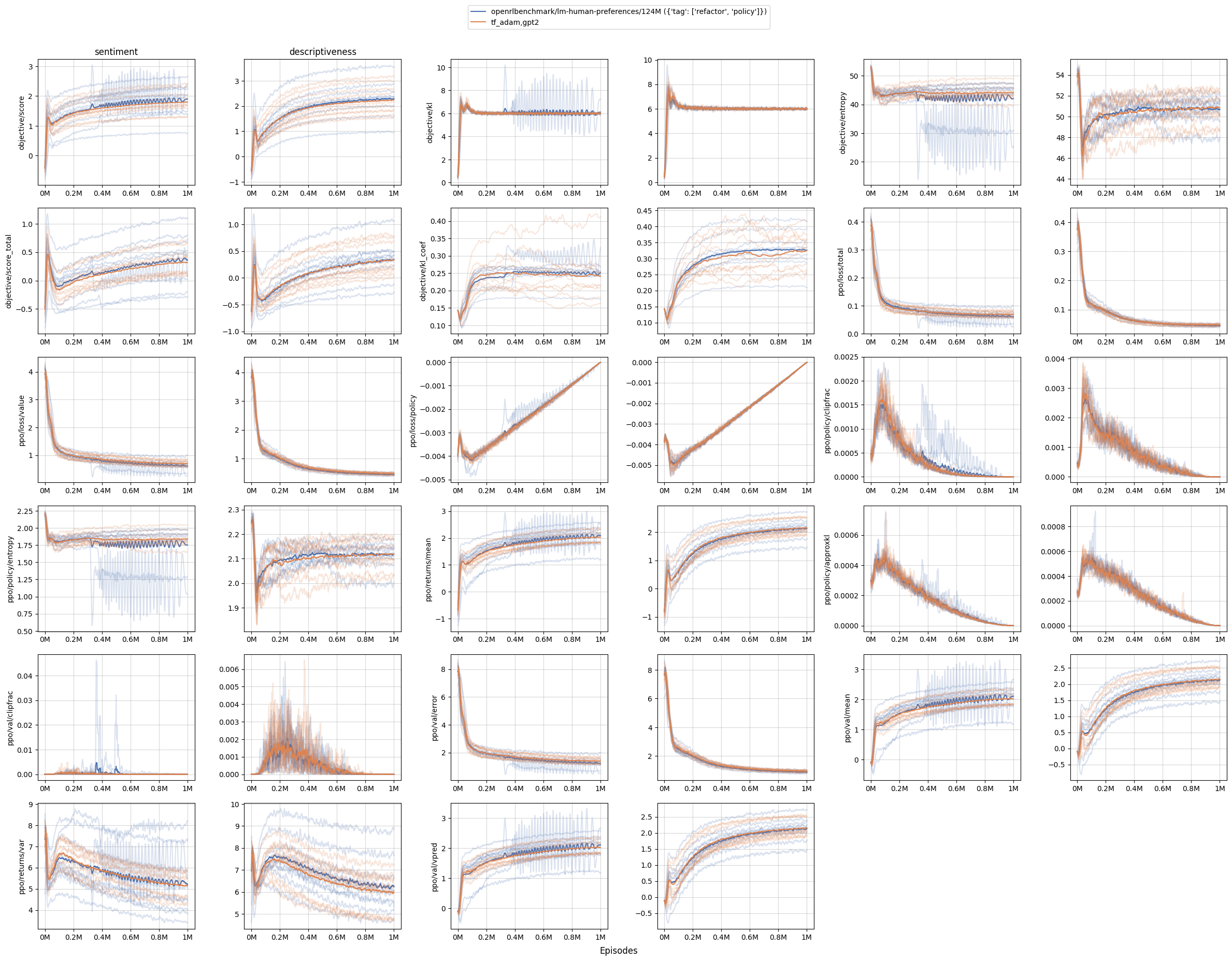 我们的主要贡献是在风格化任务中复现 OAI 的结果,例如情感和描述性。如下图所示,我们的代码库 (橙色曲线) 能够产生与 OAI 的代码库 (蓝色曲线) 几乎相同的学习曲线。