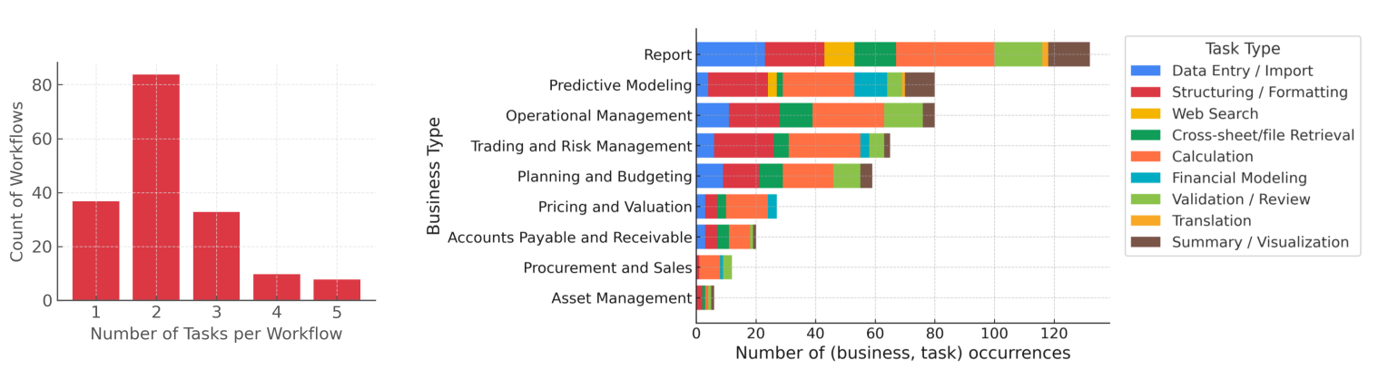 This process yields 172 enterprise-grade workflows—primarily multi-task composite workflows, involving 1,710 spreadsheets and 27 million cells, capturing the intrinsic messy, long-horizon, knowledge-intensive, and collaborative nature of real-world finance & accounting work. 92.4% of workflows involve multiple input and reference sheets, with an average of 8 sheets and a long tail reaching 91 spreadsheets. In this release, we provide full annotations for the 172 workflows and the evaluation code.