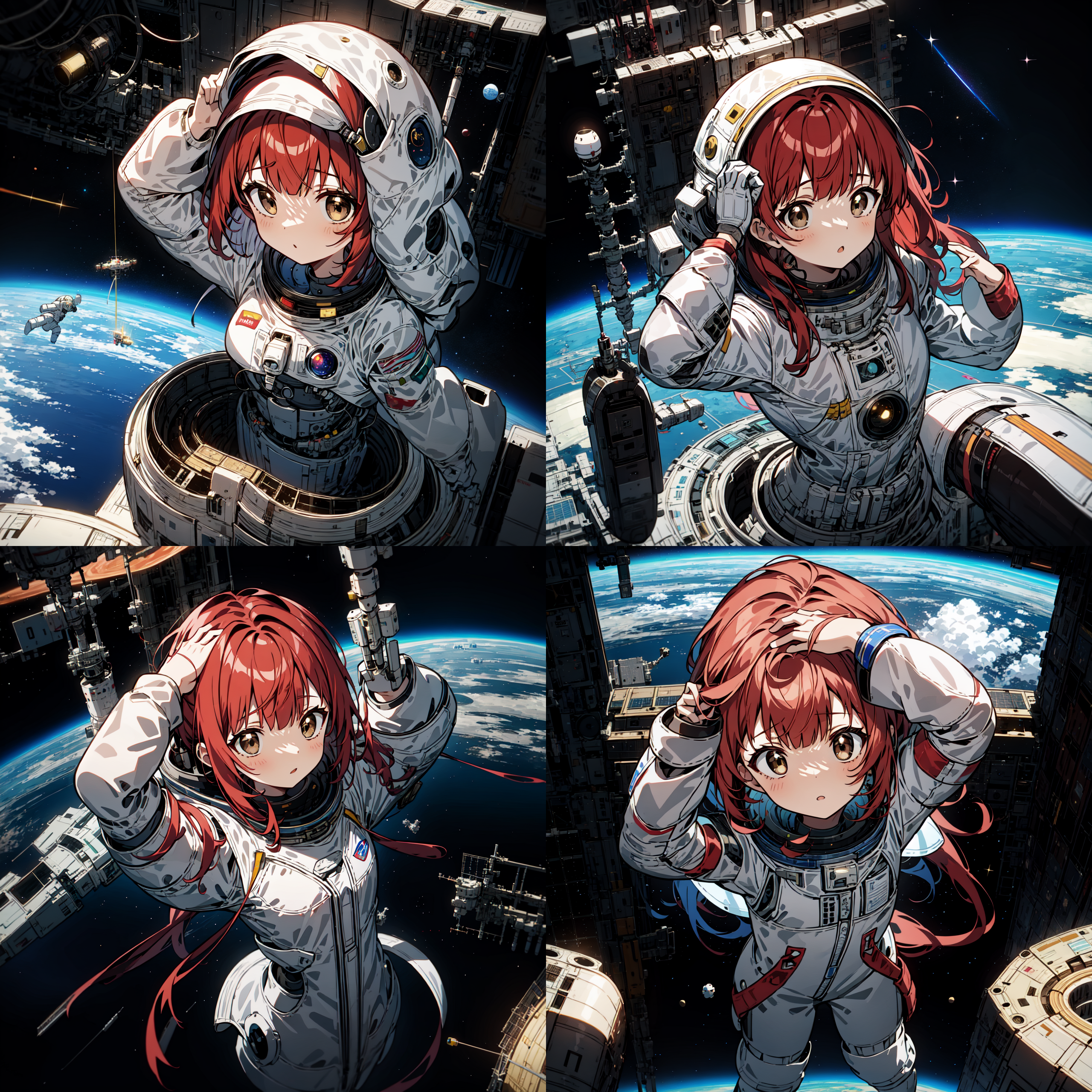 1girl, solo, from above, red hair, bowl cut, light brown eyes, small breasts, astronaut suit, hand on own head, feeling of floating, space station , surprised, nice hands, flying Negative prompt: (nsfw, extra fingers, deformed hands, polydactyl:1.3), (worst quality, low quality, poor quality, bad quality:1.35) Steps: 20, Sampler: DPM++ SDE Karras, CFG scale: 7, Seed: 2288316915, Size: 512x512, Model hash: 7ab6f37bb0, Model: FlexDreamHK_v1, Denoising strength: 0.6, Clip skip: 2, Hires upscale: 2.5, Hires steps: 10, Hires upscaler: Latent, Version: v1.4.0