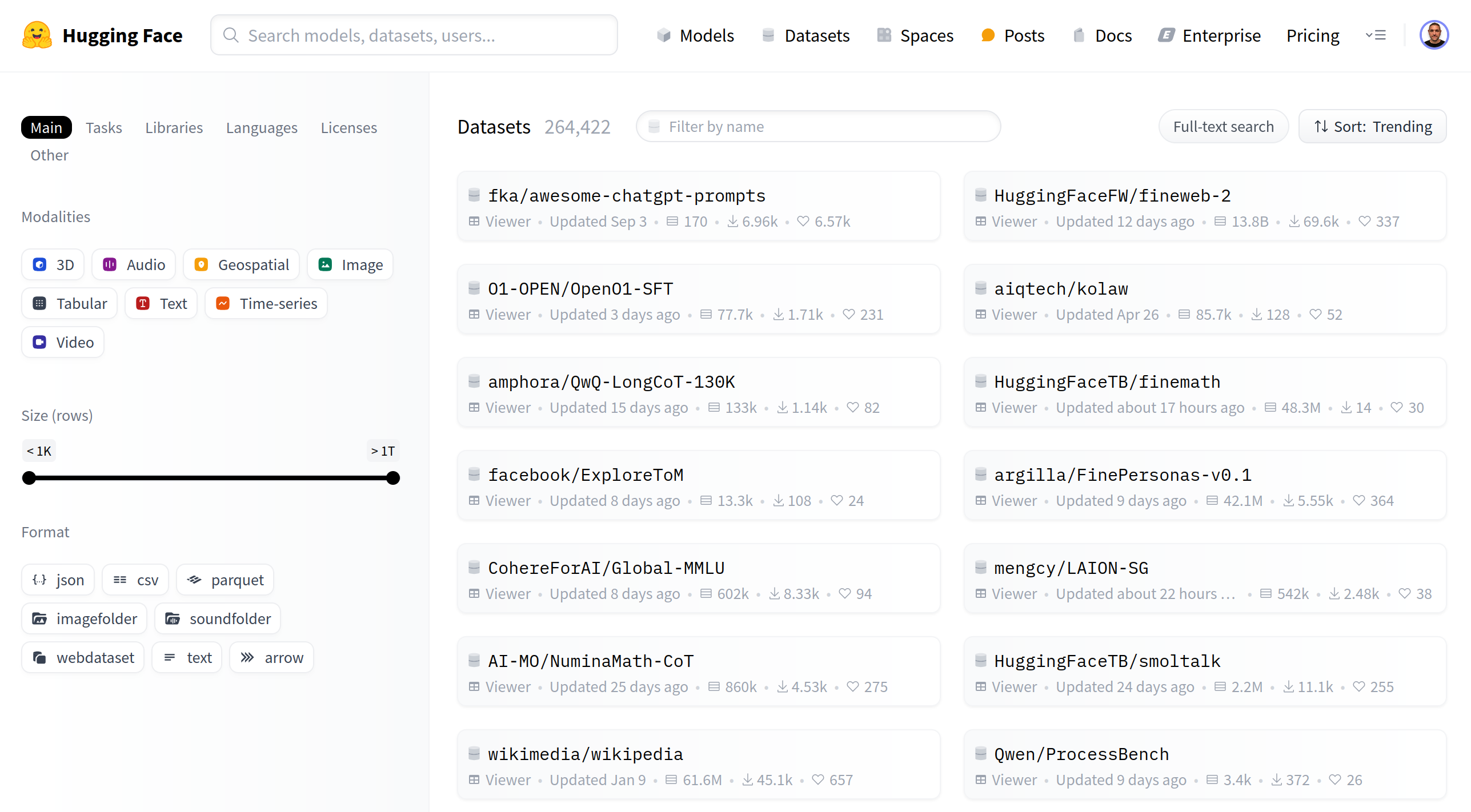 Like models and spaces, you can search the Hub for datasets using the search bar in the top navigation or on the main datasets page. There’s a large number of languages, tasks, and licenses that you can use to filter your results to find a dataset that’s right for you.