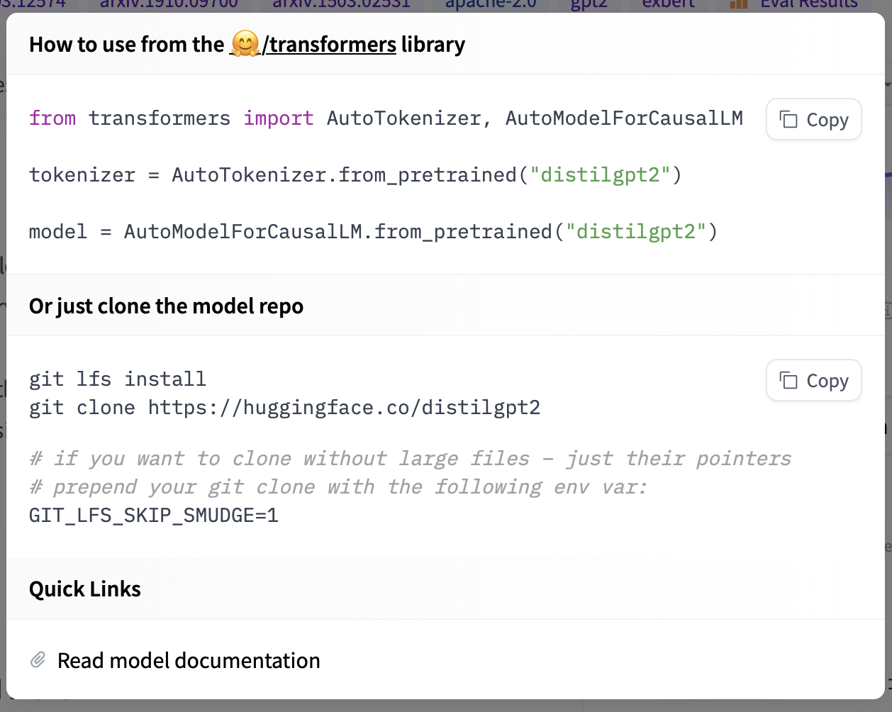 If you want to see how to load a specific model, you can click Use in Transformers and you will be given a working snippet that you can load it! If you need further information about the model architecture, you can also click the “Read model documentation” at the bottom of the snippet.
