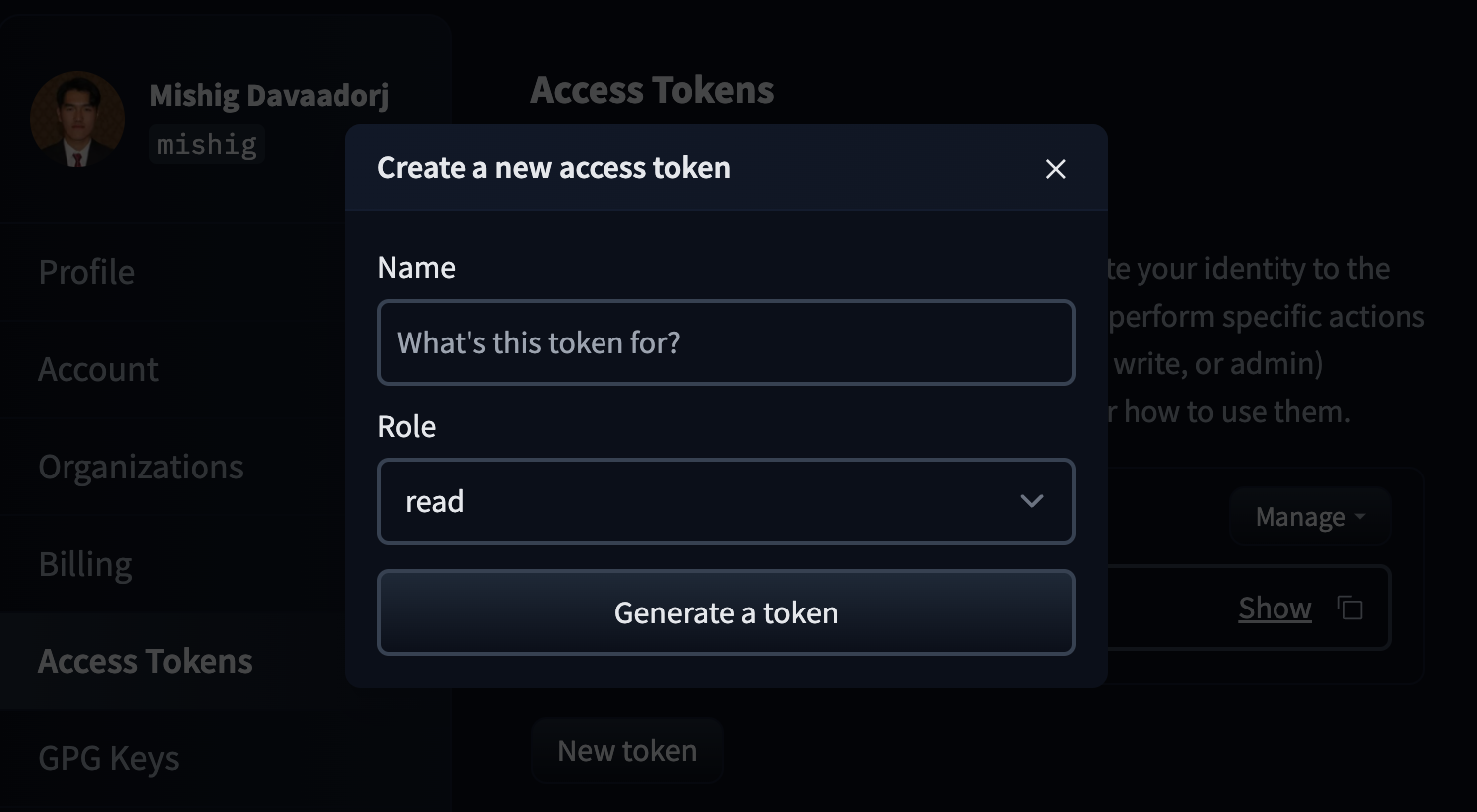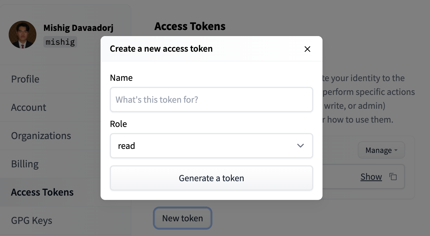 To generate an access token, navigate to the Access Tokens tab in your settings and click on the New token button. Choose a name for your token and click Generate a token (we recommend keeping the “Role” as read-only). You can then click the Copy button next to your newly-created token to copy it to your clipboard.