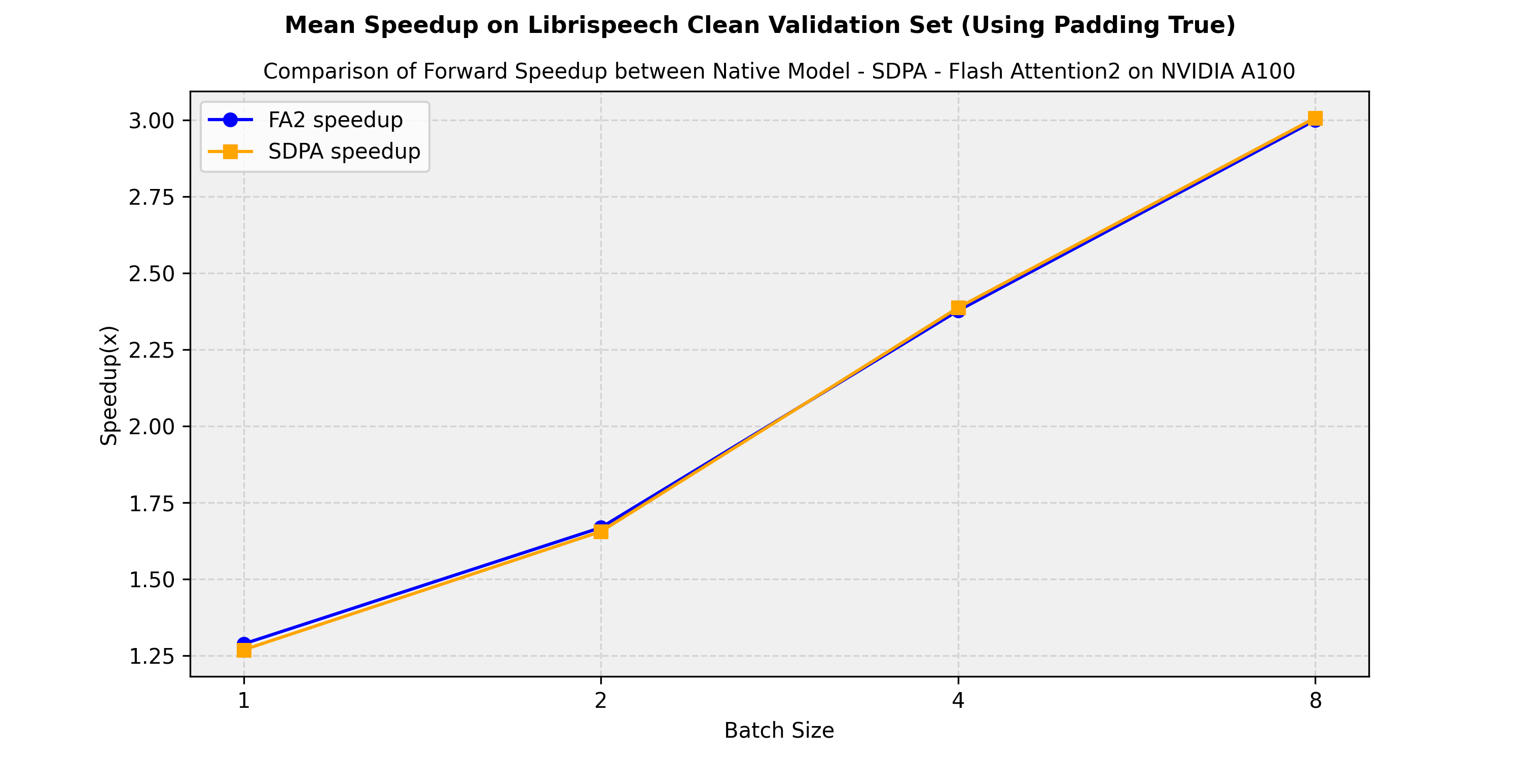 Below is an expected speedup diagram comparing the pure inference time between the native implementation in transformers of the facebook/wav2vec2-large-960h-lv60-self model and the flash-attention-2 and sdpa (scale-dot-product-attention) versions. . We show the average speedup obtained on the librispeech_asr clean validation split: