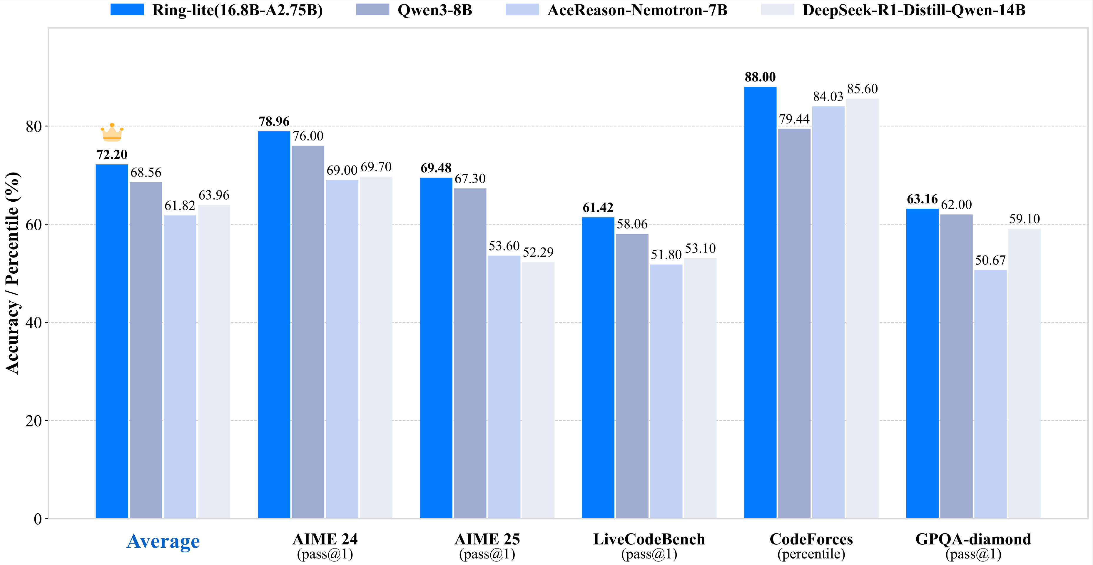Ring-lite is a lightweight, fully open-sourced MoE (Mixture of Experts) LLM designed for complex reasoning tasks. It is built upon the publicly available Ling-lite-1.5 model, which has 16.8B parameters with 2.75B activated parameters.. We use a joint training pipeline combining knowledge distillation with reinforcement learning, achieving performance comparable to state-of-the-art (SOTA) small-size reasoning models on challenging benchmarks (AIME, LiveCodeBench, and GPQA-Diamond) while activating only one-third of their parameters.