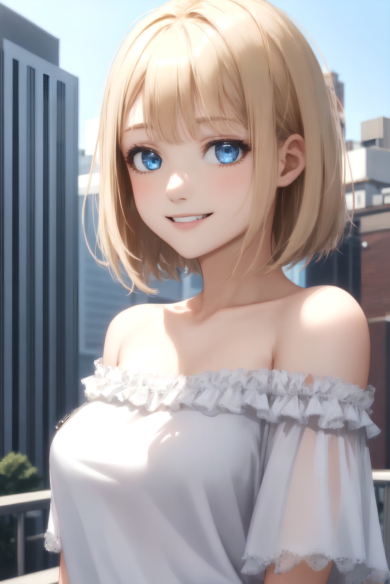 (1 girl, solo:1.5),bobcut,[smile],(off-shoulder frill blouse and tight jeans),