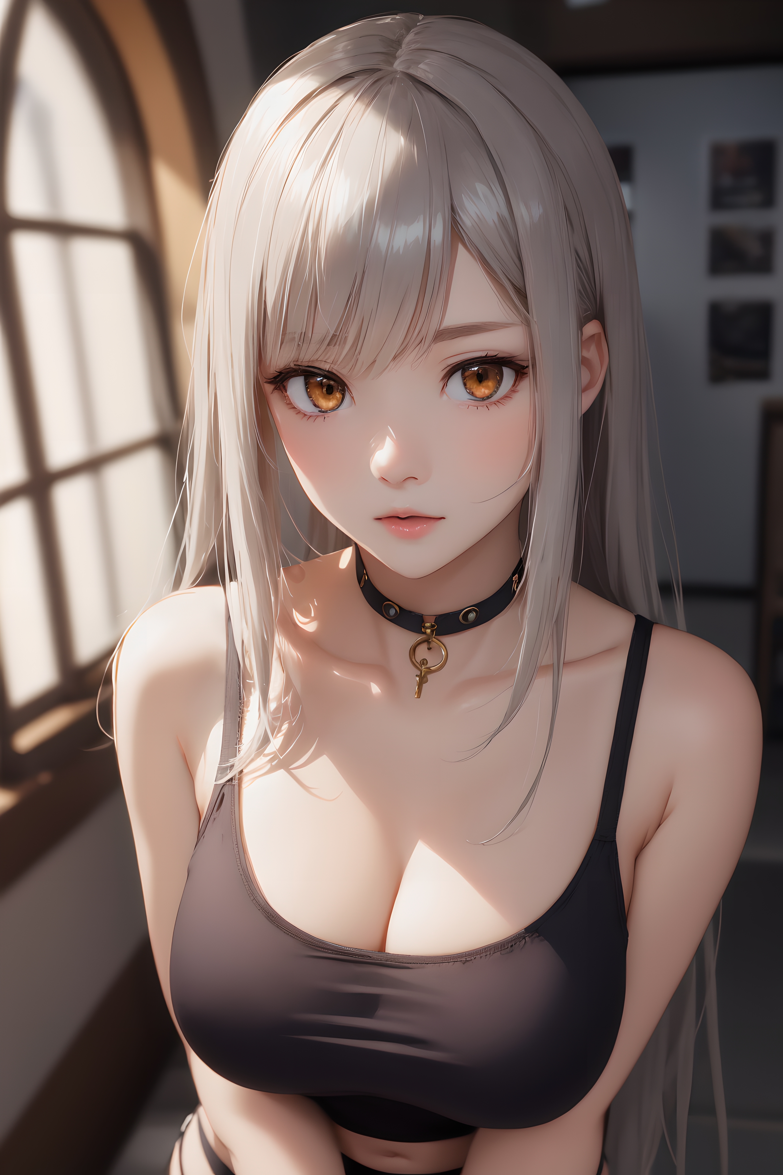 kawaii, cute,(1 girl,solo:1.3),orange_eyes:1.5,[surprised],silver hair, long hair, bangs,
