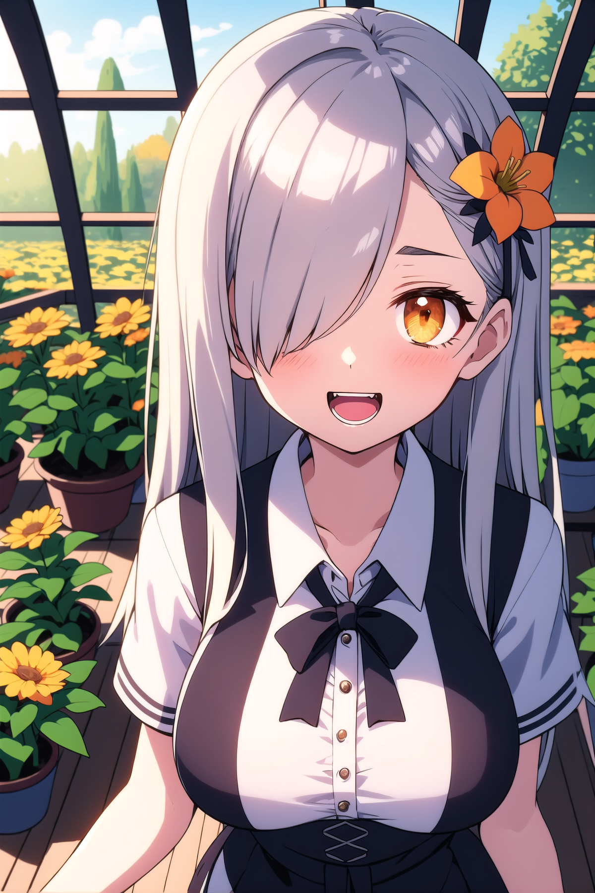 silver hair, long hair, bangs, hair flower,orange eyes,