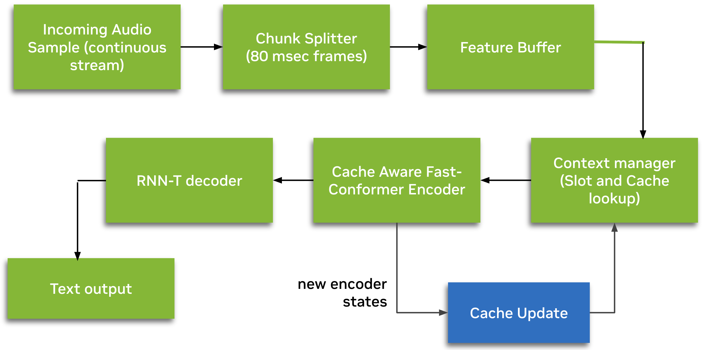 The model is based on the Cache-Aware [1] FastConformer [2] architecture with 24 encoder layers and an RNNT (Recurrent Neural Network Transducer) decoder. The cache-aware streaming design enables efficient processing of audio in chunks while maintaining context from previous frames. Unlike buffered inference, this model maintains caches for all encoder self-attention and convolution layers. This enables reuse of hidden states at every streaming step, where cached activations eliminate redundant computations. As a result, there are no overlapping computations; each processed frame is strictly non-overlapping.