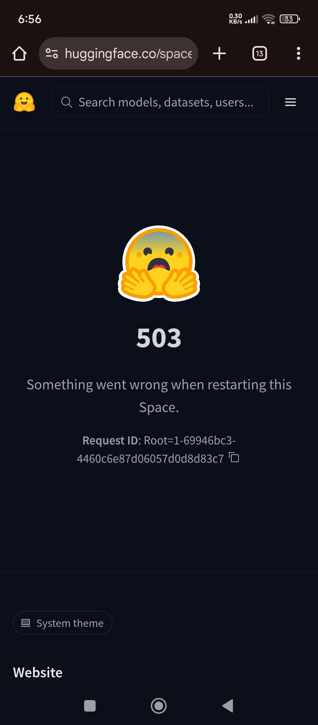 The on-screen Request ID: Root=... is an internal correlation ID that HF staff can use to trace the failure; it usually won’t tell you the cause by itself. (Hugging Face Forums)