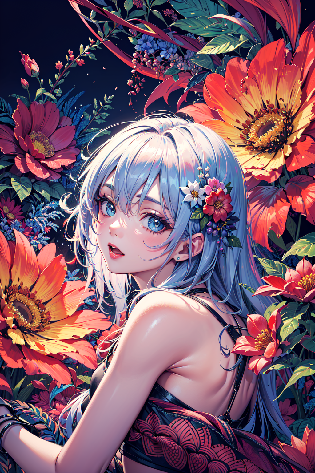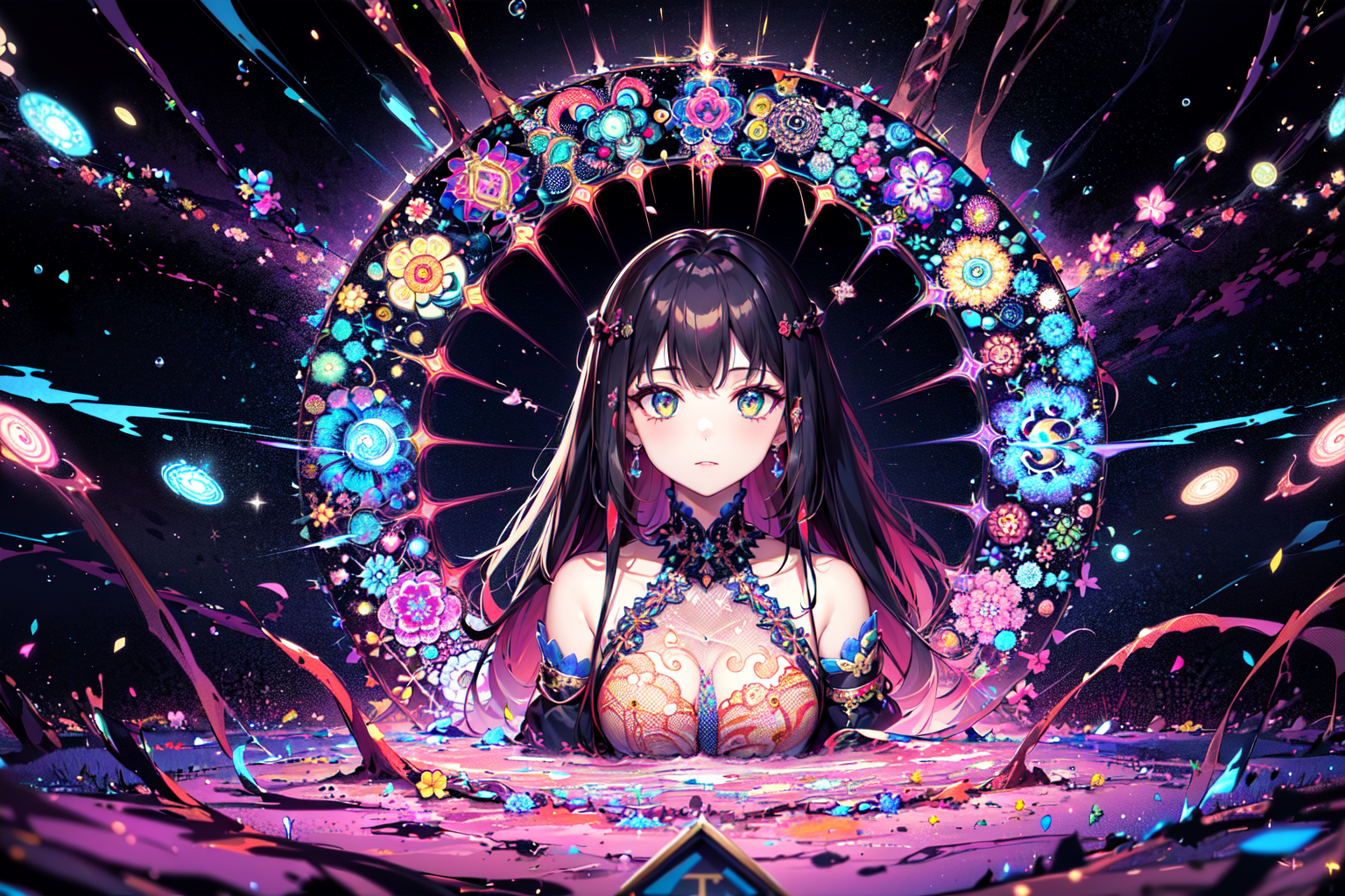 (1girl:1.45), (fractal art:1.3), zentangle, kaleidoscope, (colorfield painting:1.15), (flower effects:0.8), wild style art,